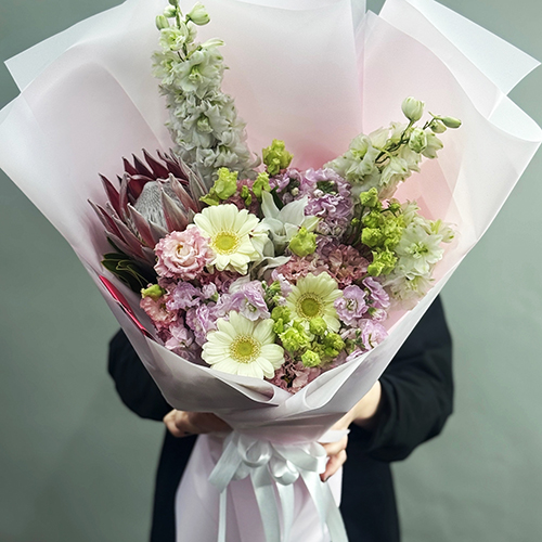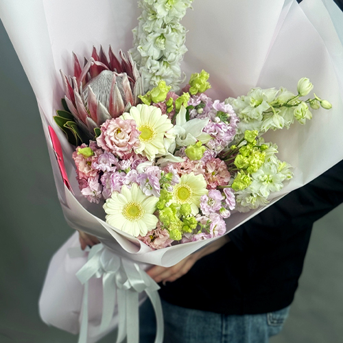 Букет "Минор" из протеи, ароматных маттиол, эустом, гербер и дельфиниума