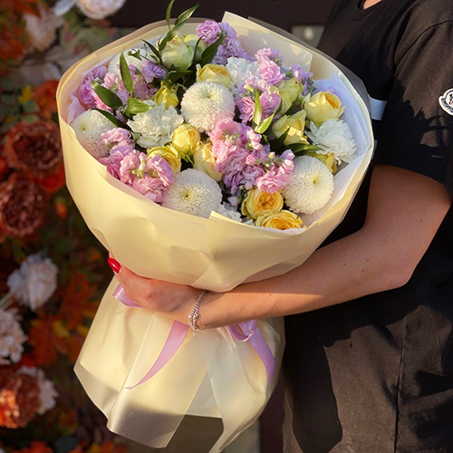 Букет "Секрет" из ароматных маттиол, диантусов, кустовых пионовидных роз и хризантем Момоко
