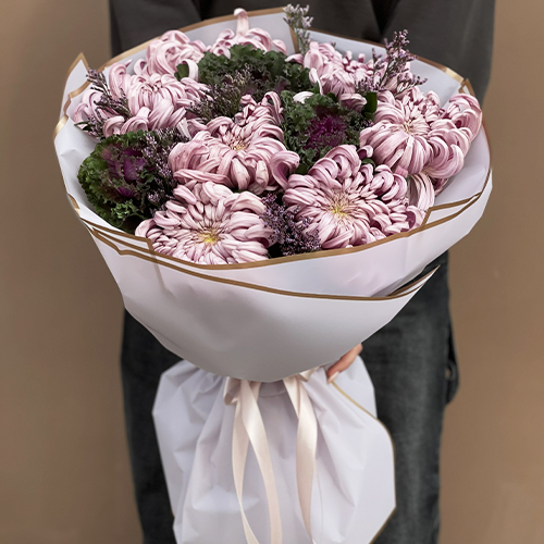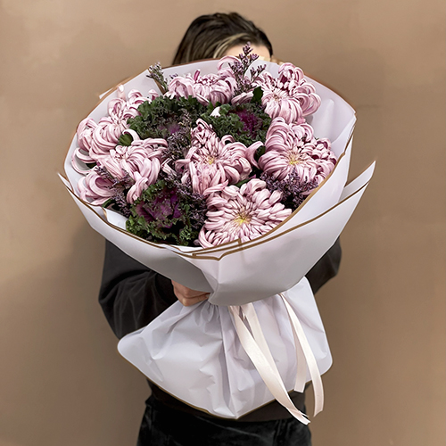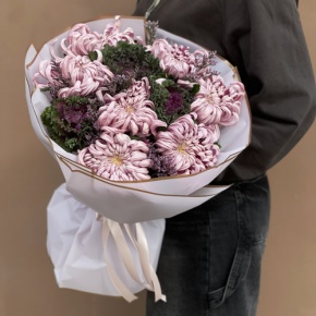 Букет "Счастье любит тишину" из хризантем Виена, брассики и лимониума