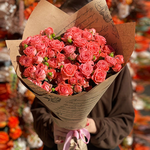 Букет из 15 кустовых коралловых роз (50 см)