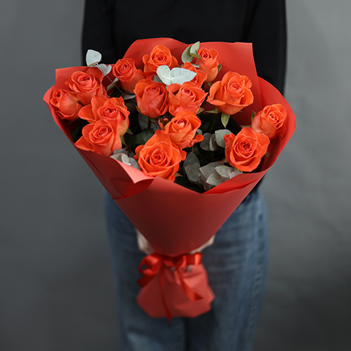 Букет из 15 морковных роз с эвкалиптом (70 см)